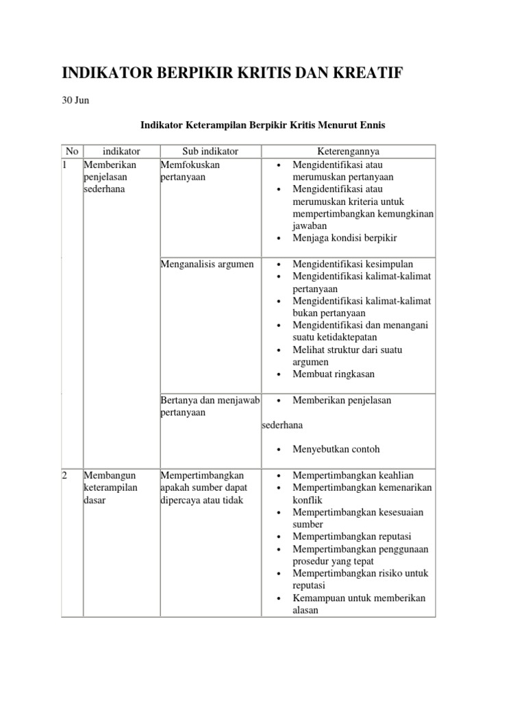 Indikator Berpikir Kritis Dan Kreatif