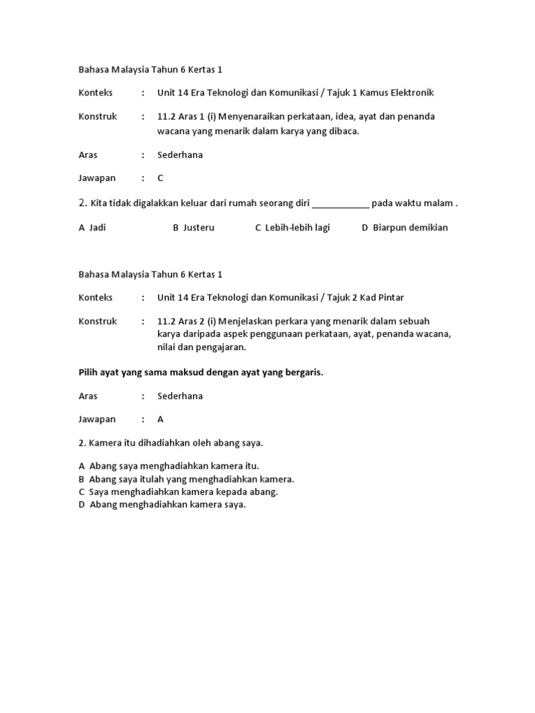 Bahasa Malaysia Tahun 6 Kertas 1 Unit 14 15 Aras Sederhana