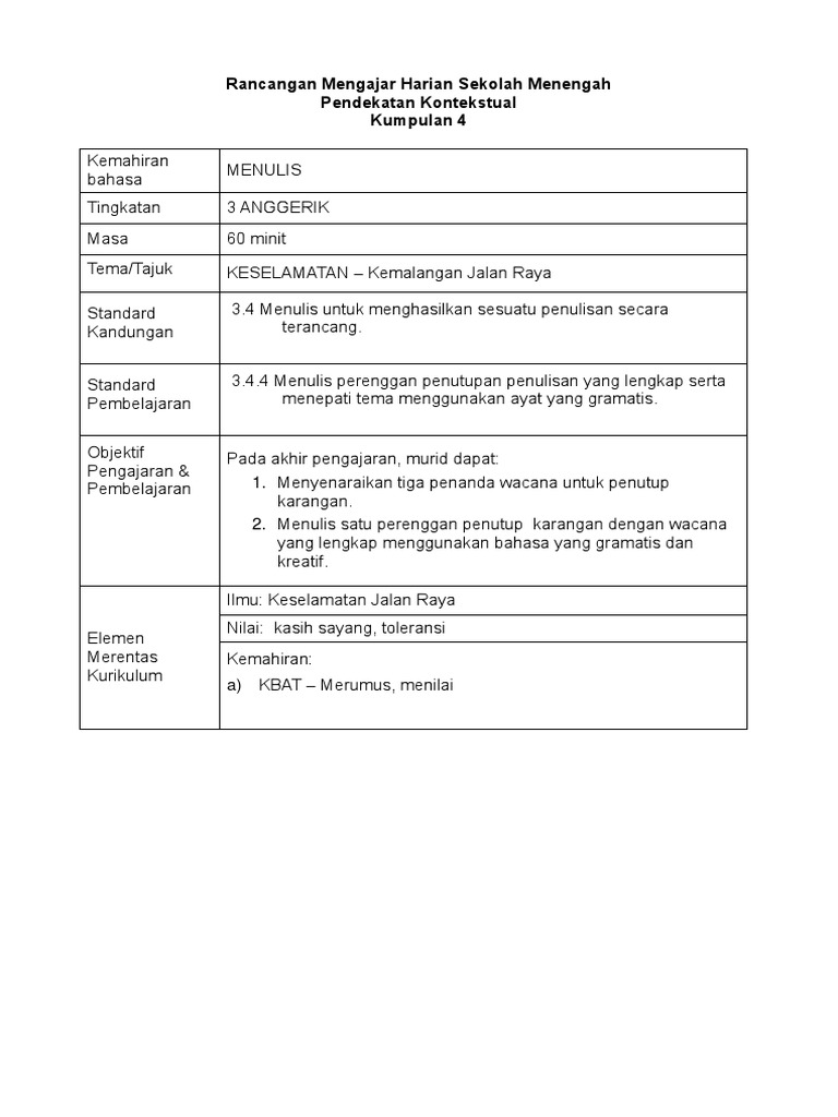 Rancangan Mengajar Harian Sekolah Menengah Pendekatan Kontekstual Kumpulan 4