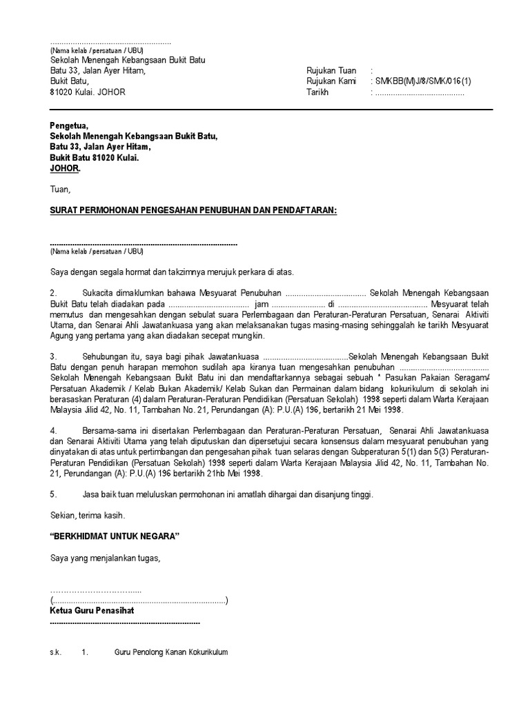 Contoh Surat Penubuhan Persatuan
