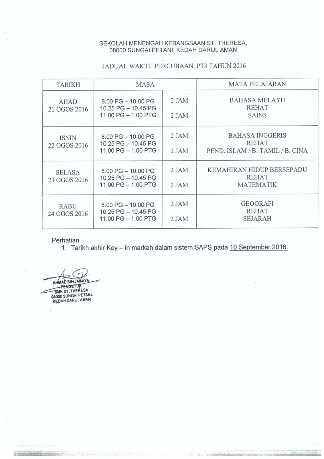 Smk St Theresa Sungai Petani Kedah Da Peperiksaan Percubaan Pt3 Dan Spm 2016