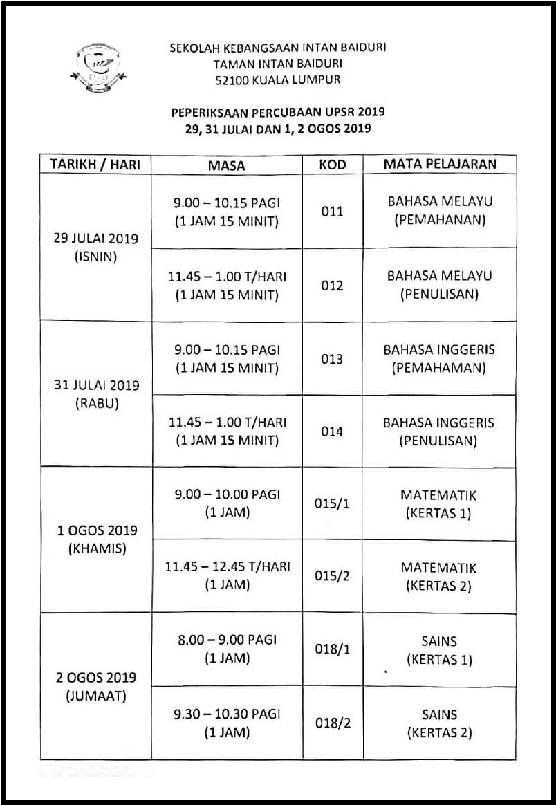 Sk Intan Baiduri Jadual Peperiksaan Percubaan Upsr 2019