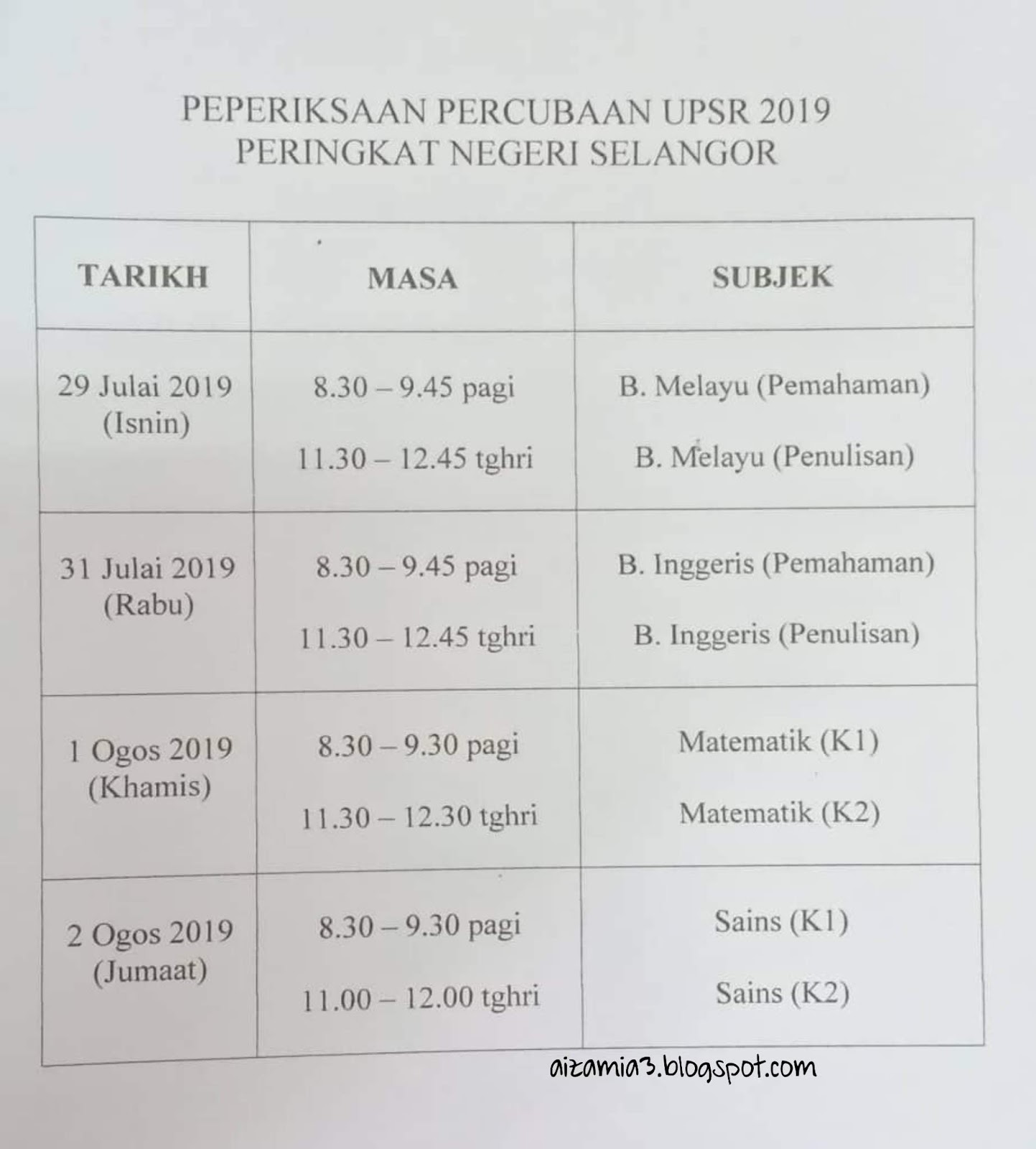 Jadual Waktu Peperiksaan Percubaan Upsr 2019 Sksn