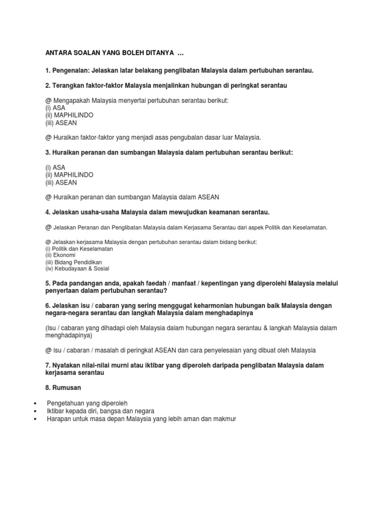 Conton Soalan Usaha Usaha Malaysia Peranan Dan Penglibatan Malaysia Politik Dan Keselamatan