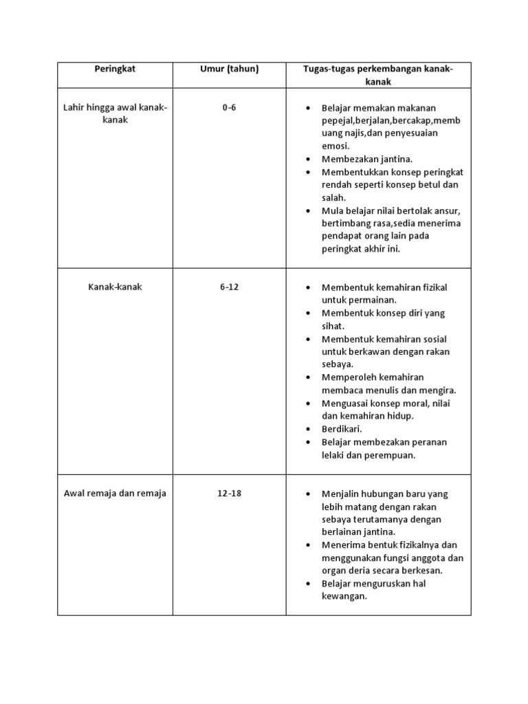 Peringkat Umur Tahun Tugas Tugas Perkembangan Kanak Kanak