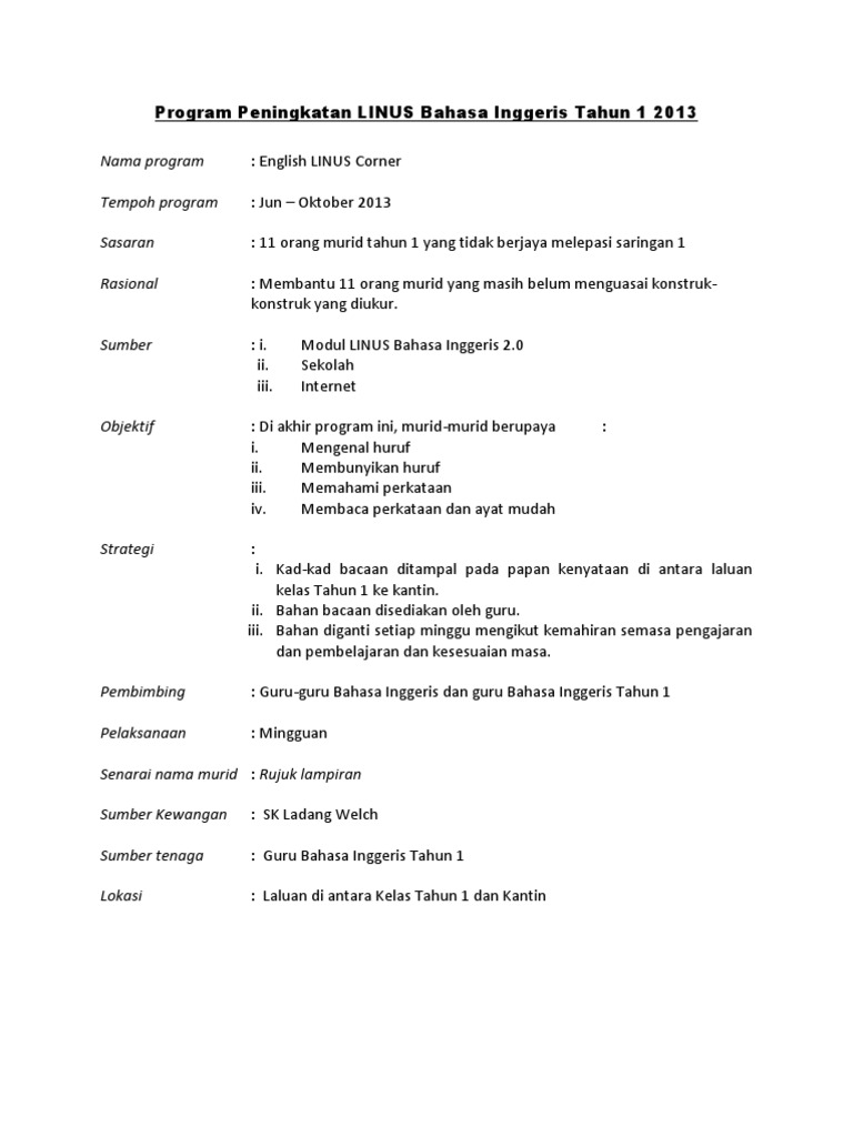Program Intervensi Linus Bahasa Inggeris Tahun 1 2 2016