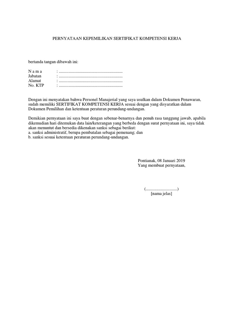 Contoh Surat Pernyataan Kepemilikan Sertifikat Kompetensi Kerja Contoh Seputar Surat