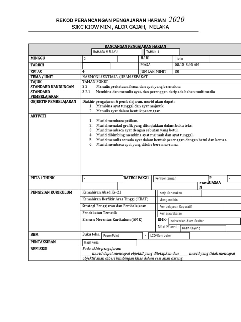 Rph Bahasa Malaysia Sjkc Bm Tahun 3 Kssr Rancangan Mengajar Harian