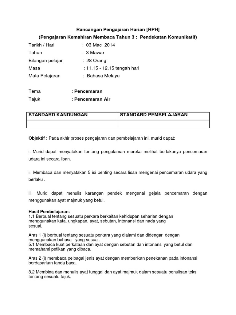 Berikut merupakan koleksi rph pelbagai subjek tahun 3 yang telah dikumpulkan. Rancangan pengajaran harian tahun 3. Rph bahasa melayu tahun 3 adalah rancangan pengajaran harian yang perlu disediakan lebih awal oleh guru sebelum menjalankan sesi pegajaran dan pembelajaran rancangan pengajaran harian ini dibina sebagai panduan para guru untuk mengajar dengan lebih sistematik dan efektif serta mampu untuk mencapai apa yang diobjektifkan dalam sesi pengajaran dan pembelajaran kelak. Ada hikmah juga encik kata rph yang aku bagi ada jumpa di internet secara langsung boleh gak praktis menulis rph sebelum nak berpraktikum bulan 3 nanti hehe.