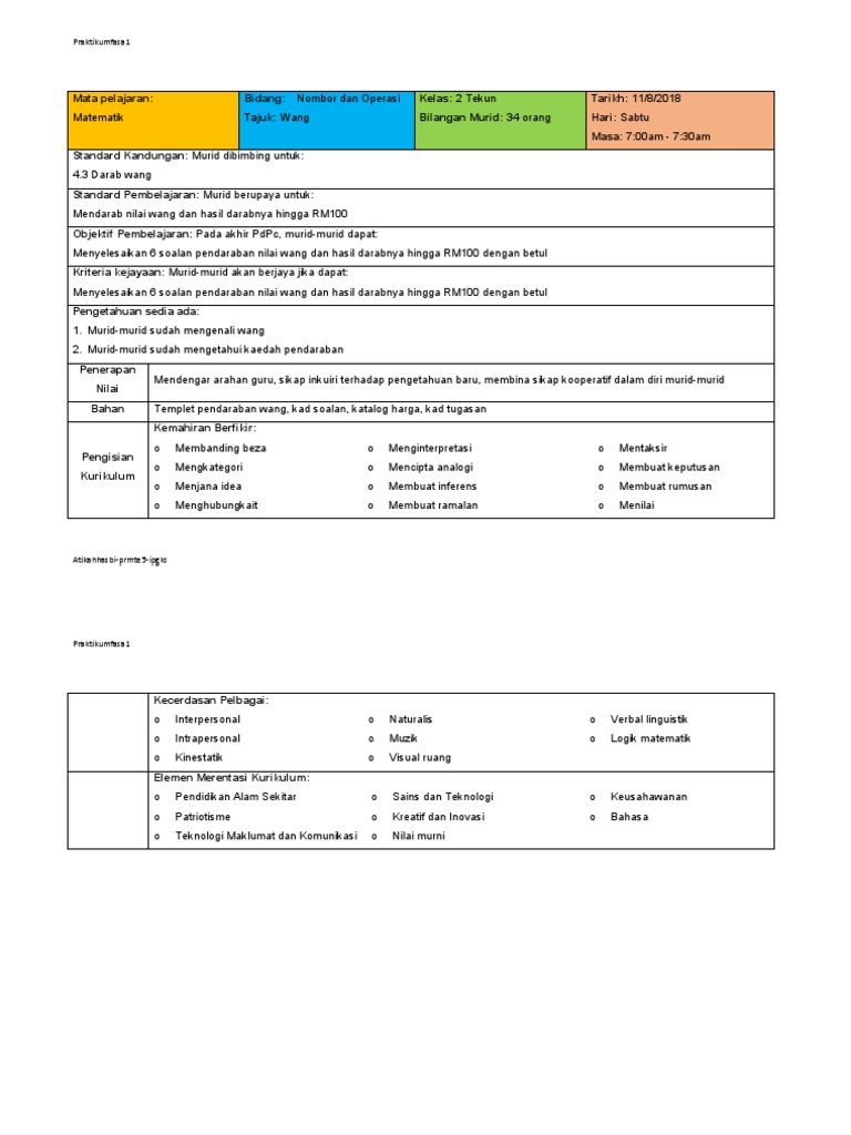 Template Rph Matematik Kssr Tahun 3 Wang