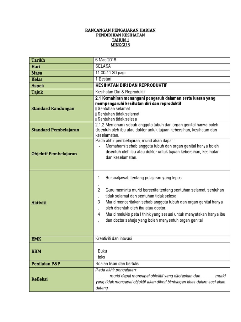 Rph Pendidikan Kesihatan Tahun 1 Gurubesar My