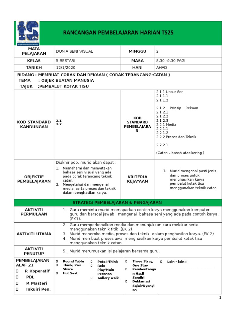 Doc Rancangan Pengajaran Harian Pendidikan Seni Visual Bil Perkara Dyana Nonong Academia Edu