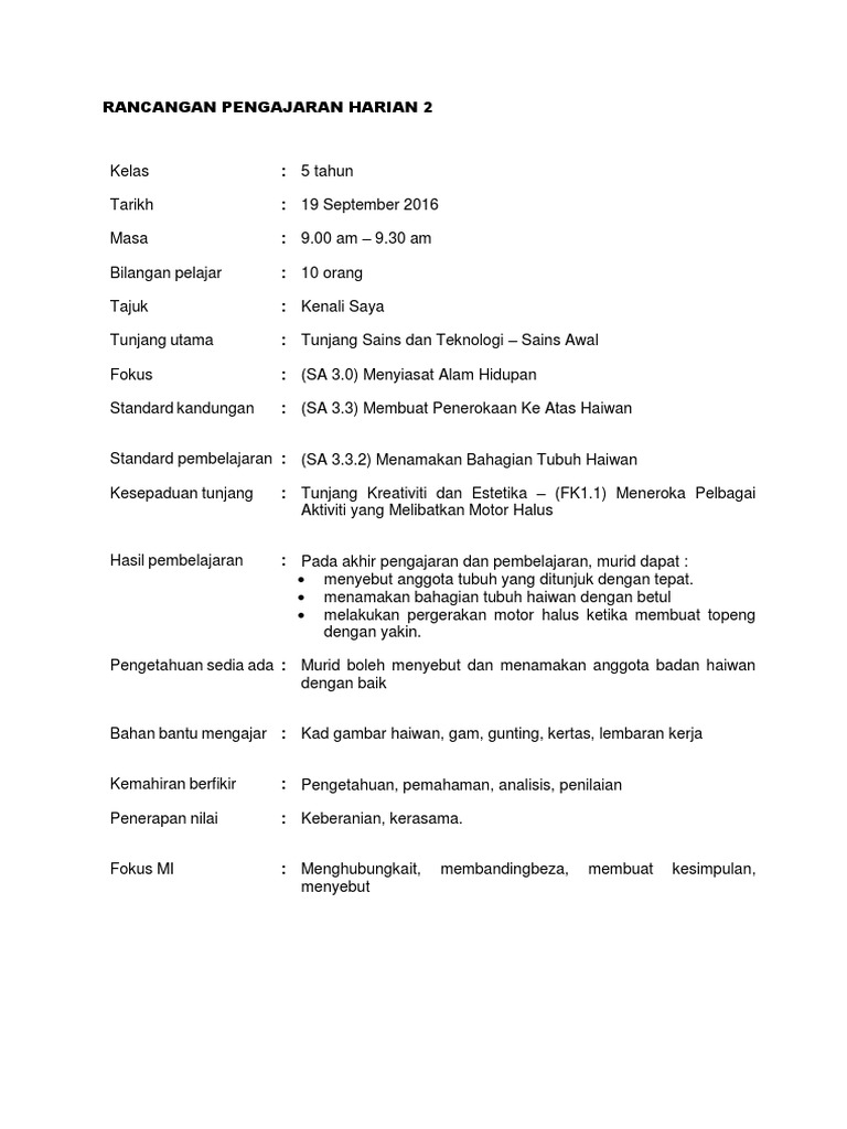 Panduan Rancangan Pengajaran Harian Tahun 1 Kssr