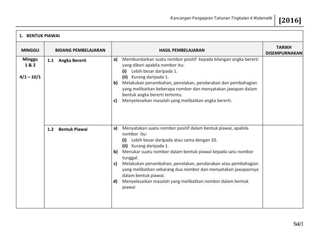 Rpt Rancangan Pengajaran Tahunan Tingkatan 4 Subjek Matematik