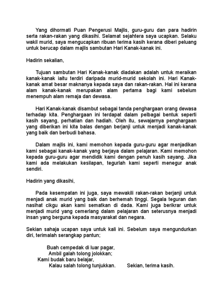 Teks Ucapan Wakil Murid Sempena Hari Kanak2 Sk Brickfields 1 2016
