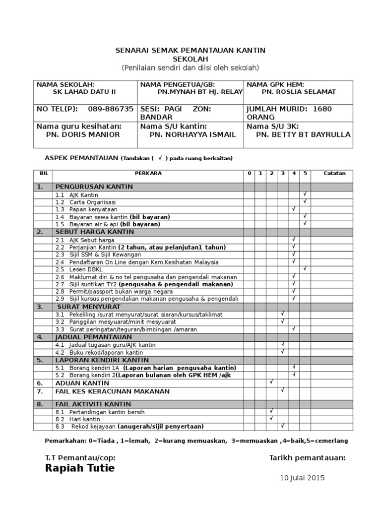Borang Senarai Semak Pemantauan Kantin Sekolah
