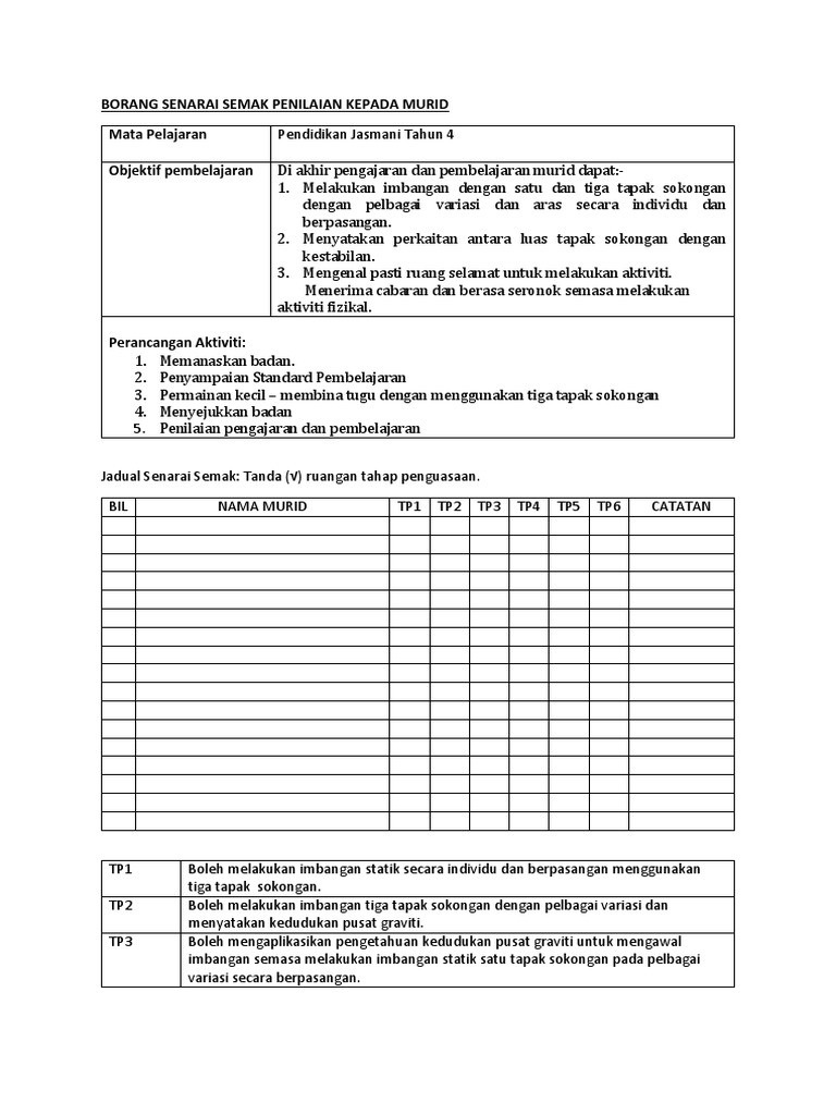 Borang Senarai Semak Penilaian Guru Kepada Murid Pj Tahun 4 Docx