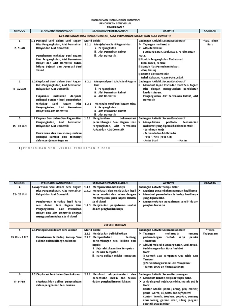 Rancangan Pengajaran Harian Pendidikan Seni Tingkatan 2 Kssm Minggu 1 Hingga 11
