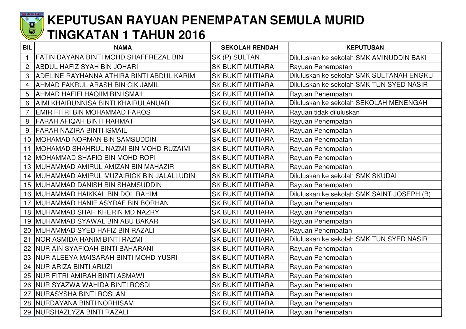 Smk Majidi Baru 2 Keputusan Rayuan Penempatan Semula Murid Tingkatan 1 Tahun 2016